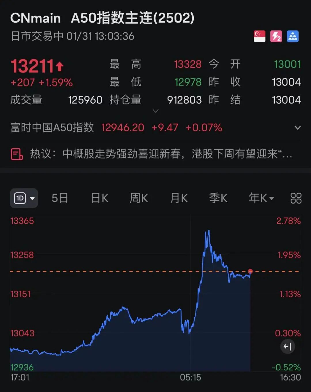 1月31日,富时中国A50指数期货直线拉升,涨幅一度达2.10%,实现发稿涨1.59%。