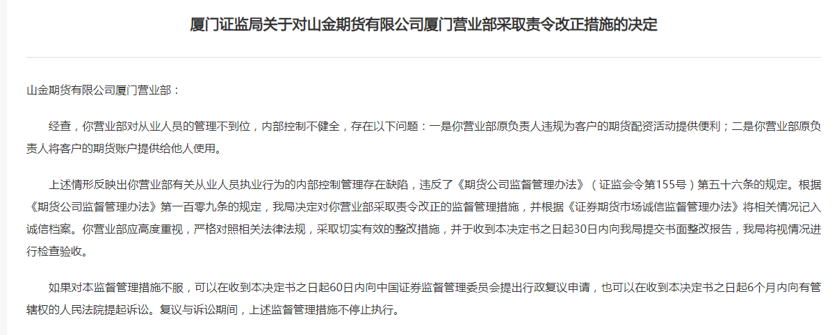 日前,厦门证监局发布对于对山金期货有限公司厦门交易部罗致责令改正措施的决定。